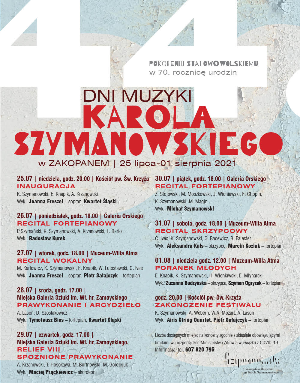 Liczba dostępnych miejsc na koncerty zgodnie z aktualnie obowiązującymi limitami wg rozporządzeń Ministerstwa Zdrowia w związku z COVID-19. Informacja: tel. 607 820 795.